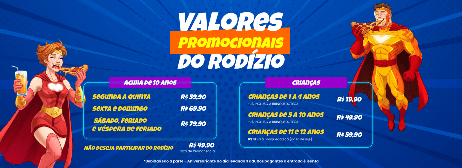Só na Quarteto Massa você terá uma experiência incrível com entretenimento em um ambiente totalmente temático com os nossos heróis e um excelente rodízio de pizzas e massas, além de uma brinquedoteca inédita que conta com uma montanha russa virtual.